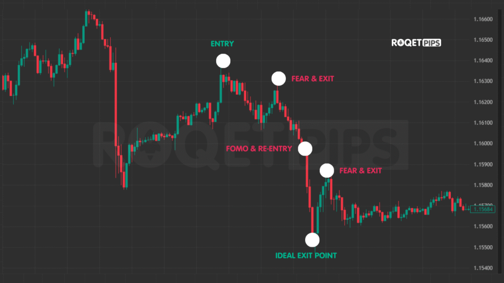 On a chart, FOMO is most visible through “chasing” behavior. A trader sees a long, vertical green candle and enters at the very top, fearing they will miss the rest of the move. Mathematically, this is the worst time to enter because the risk-to-reward ratio has likely collapsed; the price has already moved far from a safe “stop loss” level.